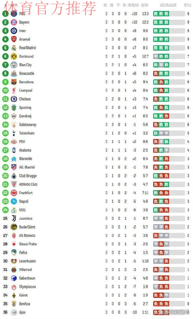 欧冠积分榜巨变:5队3战全胜!两大前冠军3连败,下轮3场世纪大战